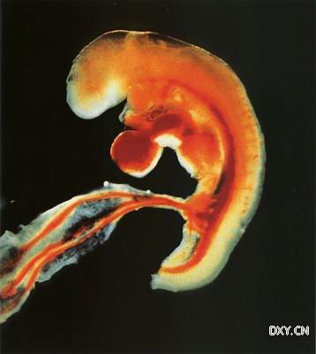 受精后6周,人形已隐约可见。这时,胚胎的心跳每分钟140—150下.是母亲心跳的两倍