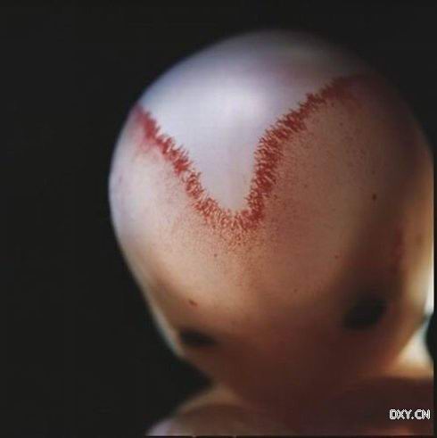 已经9个星期了,在头部有清晰的V字形血管,头骨正在发育。