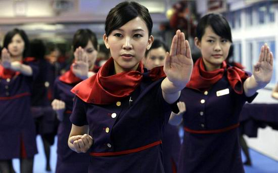 2011年4月30日,香港,香港航空乘务人员练习咏春拳。香港航空此举旨在提高团队精神,并提高空乘人员的自卫能力。
