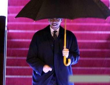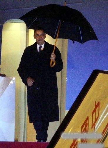 11月15日晚11时20分左右,奥巴马乘坐“空军一号”飞机,在细雨中抵达上海浦东机场。飞机舱门缓缓打开后,奥巴马穿着黑色风衣,独自打着一把黑色雨伞,轻快地沿舷梯拾级而下,走向一个陌生的国度———中国。