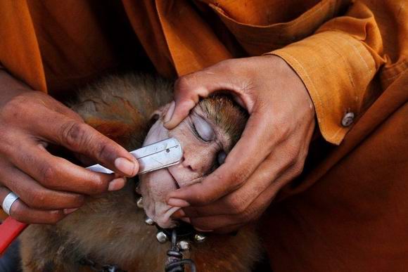 当地时间2013年10月7日,巴基斯坦拉合尔,一名男子在猴戏表演前为猴子剃胡子。